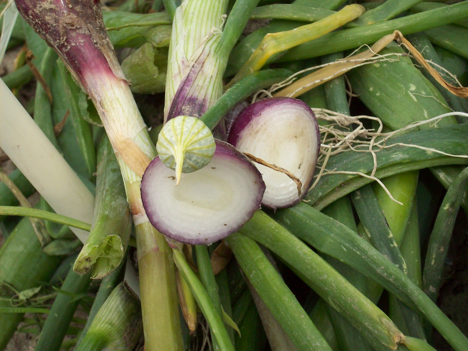 Ik had echt geen flauw idee waar hij het over had. Hij heeft het mij uitgelegd. Alle uienplanten waar een stengel zichtbaar wordt met daaraan een bloem, dat is een mannetjesplant. De stengel loopt door in de ui en geeft een keihard, stuk in de ui zelf. Hij heeft er een doorgesneden om het te laten zien.